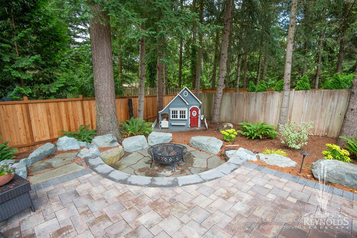 Paver patio with boulder-seat fire feature.